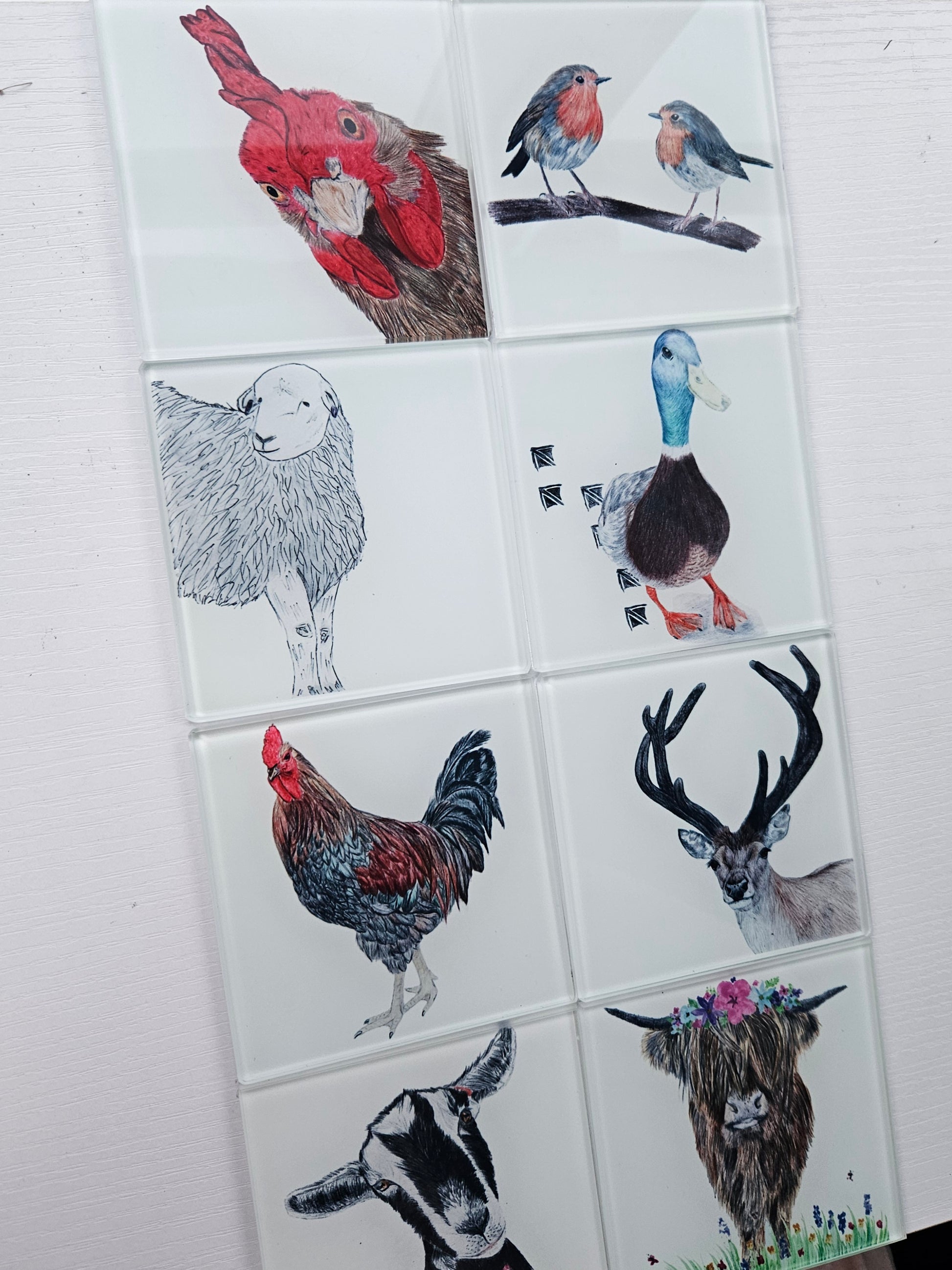 8 Glass coasters printer to photograph for the website so have been handled, picture sizing might not be 100% accurate and Aurora Goat and The Floral Coo images are reversed.
